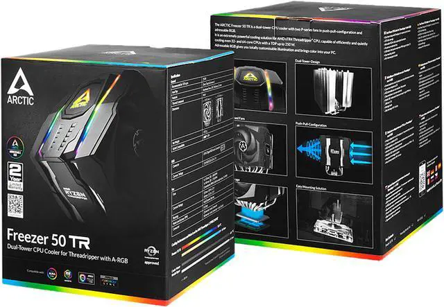 Equipped with two fans (120mm & 140mm) in pull-push configuration, and eight heat pipes that penetrate dual-tower heat sinks, the Freezer 50 TR delivers extremely powerful cooling for AMD Ryzen Threadripper CPUs up to 32 cores and beyond. It works with AMD sTR4 platform, and offers clearance for RAM modules up to 37.5mm in height. Plus, the Freezer 50 TR has addressable RGB lighting onboard, which can be customized with multiple built-in modes, or even synced with leading motherboard lighting solution like ASUS Aura Sync, GIGABYTE RGB Fusion, MSI Mystic Light Sync and ASRock Polychrome Sync.