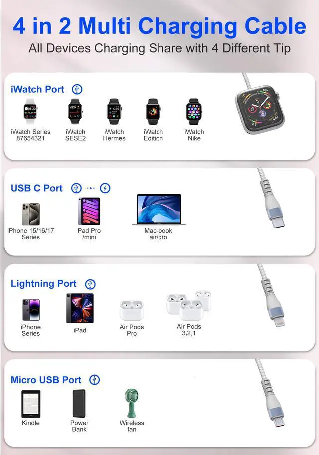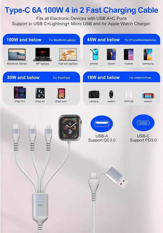 All-in-One Multi Charging Cable for Apple WatchThis 4-in-2 multi charging cable integrates four output ports (100W USB-C, 27W Lightning, Micro-USB, and magnetic Apple Watch charger) with dual input (USB-A/USB-C). MFi-certified and designed to charge multiple devices simultaneously, it eliminates cable clutterperfect as a travel essentials kit for home, office, or on-the-go use. The 10-foot length offers flexibility while charging your laptop, iPhone, and Apple Watch with ease.