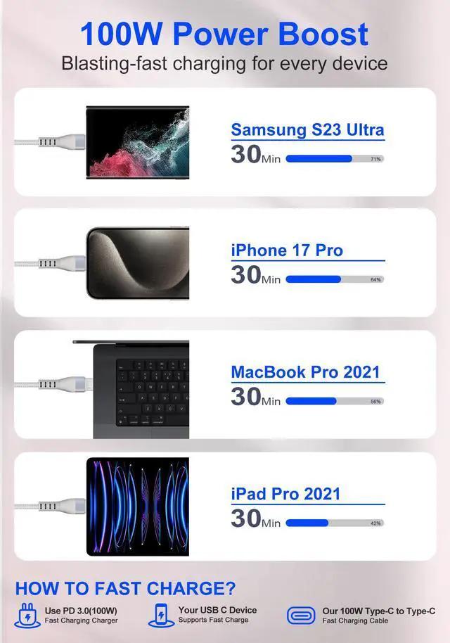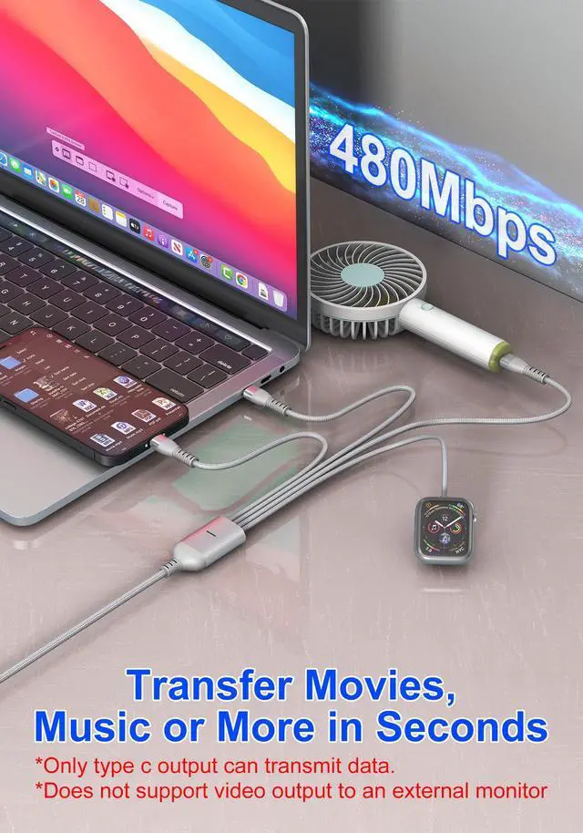 100W PD Fast Charging for High-Speed PowerExperience ultra-fast charging with the 100w multi charging cable USB-C port, delivering up to 100W Power Delivery to compatible devices like MacBook Pro, iPhone 15, and Samsung Galaxy. Note: Achieve maximum speed with a PD wall charger (not included). This apple watch charger fast charging feature ensures your devices power up quickly, saving time during busy days or travel.