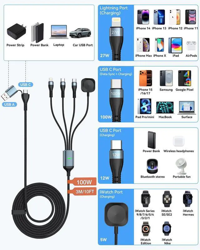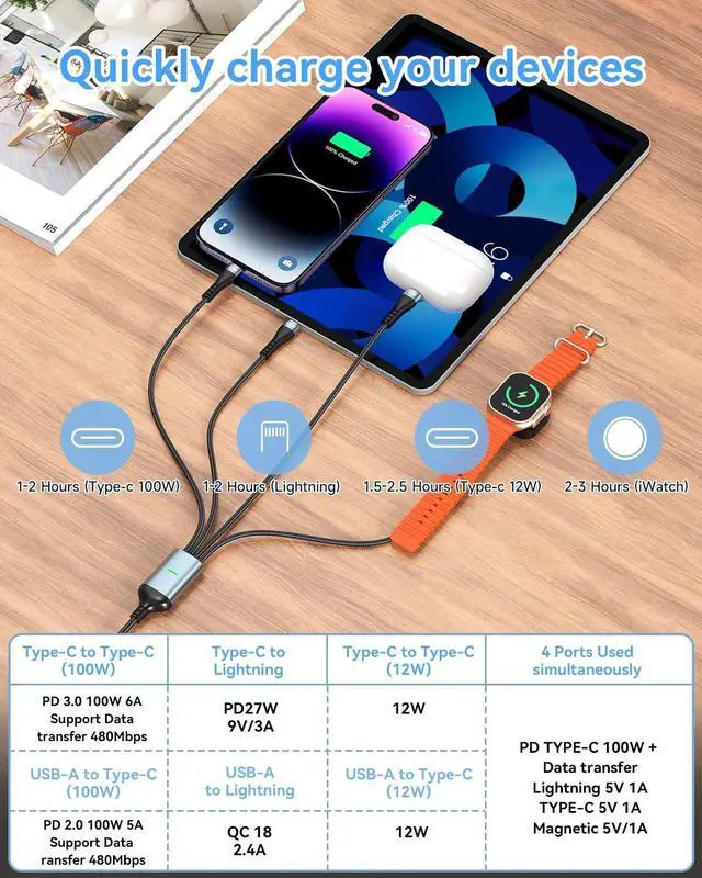4 in 2 Multi Charging Cable Simplify Your Charging RoutineMeet the 4 in 2 multi charging cable that replaces every other cord. Equipped with four output ports a 100W USBC for laptops/phones, a 12W USBC, a Lightning connector, and a magnetic Apple Watch charger it powers all your essential devices at once. Dual USBA/USBC inputs make it universally compatible with adapters or power banks for travel, office, or home.