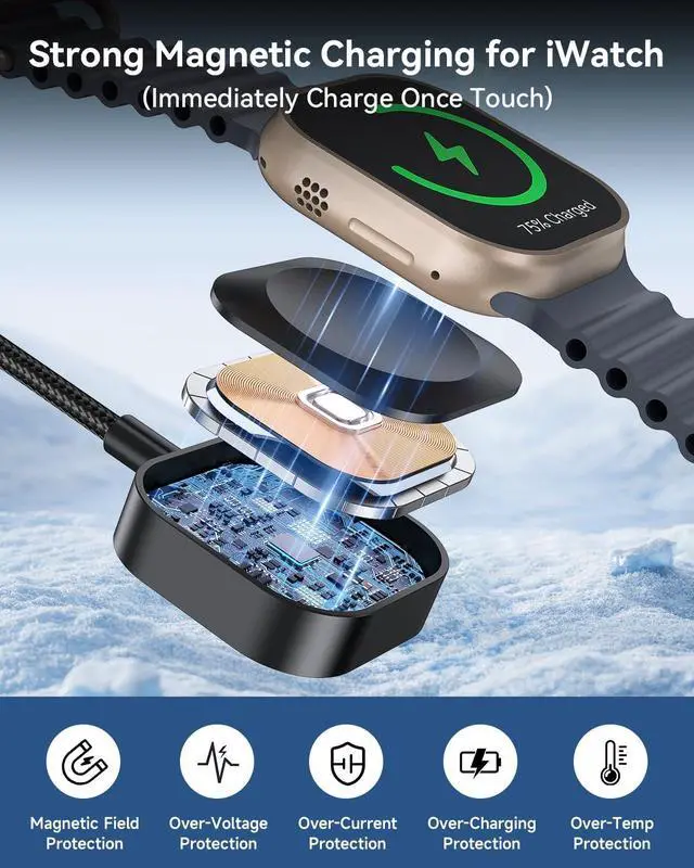 Exclusive Magnetic Charging for Apple WatchThis integrated multi charging cable for iwatch creates a reliable, cablefree Apple Watch experience. The builtin magnetic Apple Watch Charger secures instantly for stable, Compatible with all models from Series 110, SE, and Ultra/Ultra 2. No extra puck, no clutter just seamless energy transfer optimized for wearables.