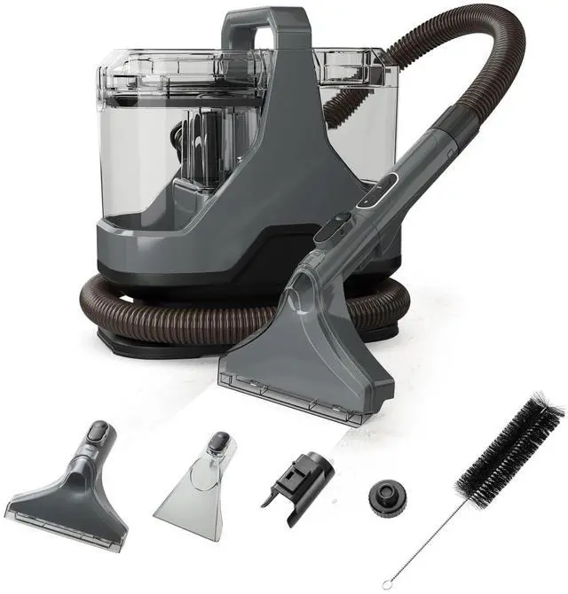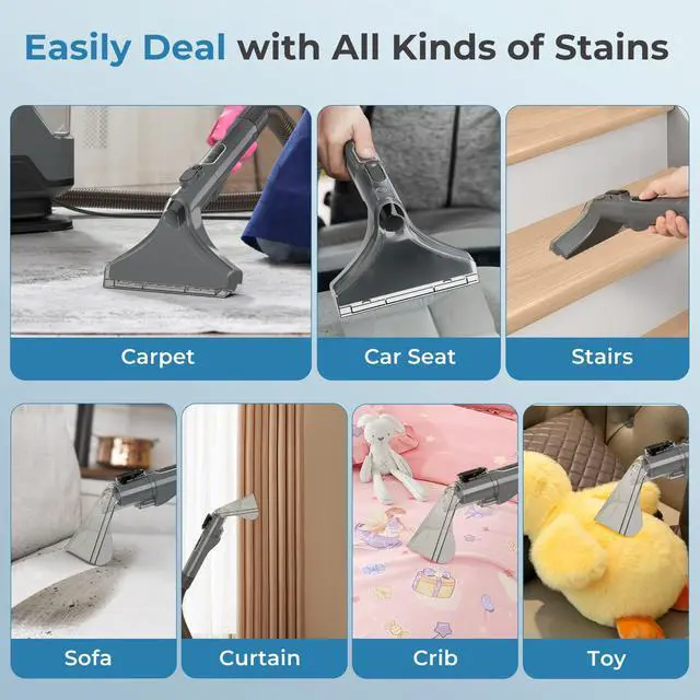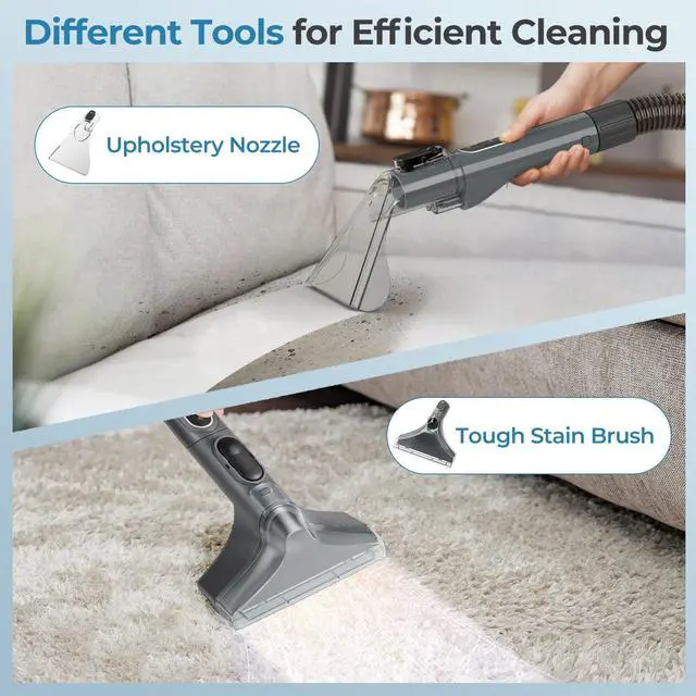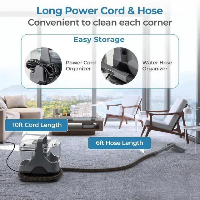 Experience the power of the 600W carpet and upholstery spot cleaner, designed for efficient cleaning with powerful suction and high-pressure water spraying. The deep stain remover comes with different tools for efficient cleaning, an upholstery nozzle for gentle cleaning and a tough stain brush for tackling resilient stains. With 2 removable water tanks, you can enjoy extended cleaning sessions without any mess. When the water exceeds the maximum water level, the machine will automatically stop. The carrying handle, 10 ft cord length, and 6 ft hose length provide extensive reach to tackle stains far and wide. When it comes to storage, this compact cleaning machine fits seamlessly in small spaces and includes organizers for the power cord and water hose. Cleanup is a breeze with the sewage tank brush included.