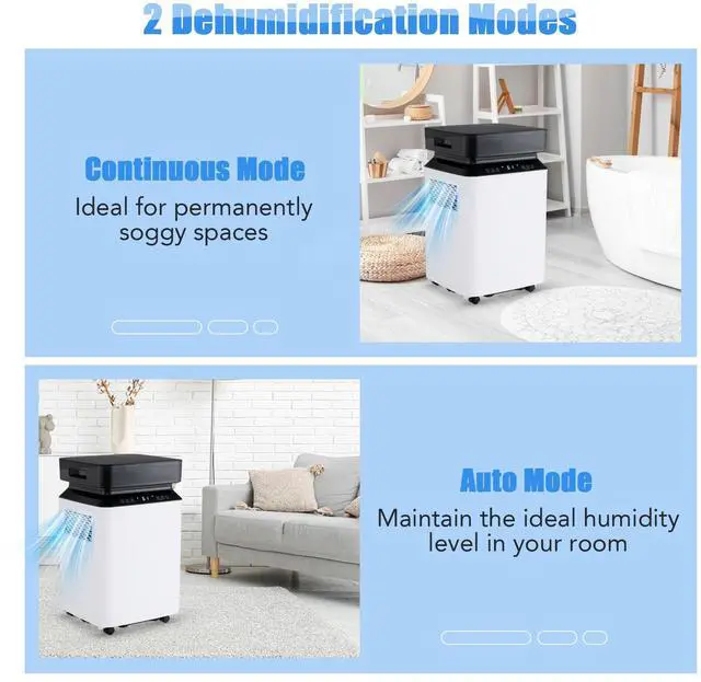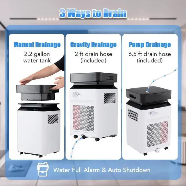 Capable of removing up to 70 pints of excess water per day, this dehumidifier is an ideal solution for maintaining optimal humidity levels in large spaces up to 4500 sq.ft. It is equipped with continuous mode and auto mode for versatile humidity control. And the humidity setting ranges from 30%- 80%. The 2.2-gallon water tank minimizes the frequency of tank emptying, while the 3 drainage options with 2 included drain hoses offer great flexibility. Air quality is significantly enhanced through the 2-stage filtration system. Moreover, the intelligent touch panel with LED display allows you to easily set the mode, 0-24h timer, high/low fan speed, humidity adjustment, power and so on.