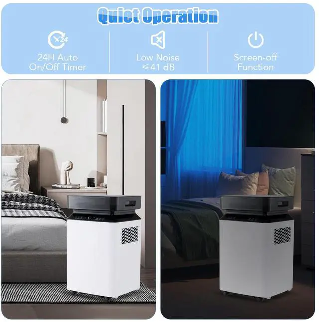 Capable of removing up to 90 pints of excess water per day, this dehumidifier is an ideal solution for maintaining optimal humidity levels in large spaces up to 6000 sq.ft. It is equipped with continuous mode and auto mode for versatile humidity control. And the humidity setting ranges from 30%- 80%. The 2.2-gallon water tank minimizes the frequency of tank emptying, while the 3 drainage options with 2 included drain hoses offer great flexibility. Air quality is significantly enhanced through the 2-stage filtration system. Moreover, the intelligent touch panel with LED display allows you to easily set the mode, 0-24h timer, high/low fan speed, humidity adjustment, power and so on.