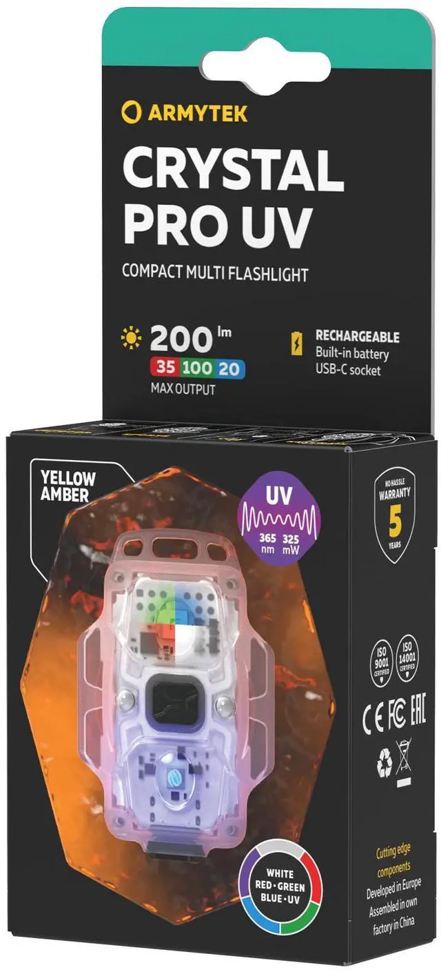 A model from the updated lineup of compact multi flashlights. Crystal Pro UV is a universal flashlight that combines the most popular light options. White, red, green, blue and ultraviolet light outputs provide even more opportunities to use the flashlight in everyday life or in professional activities.