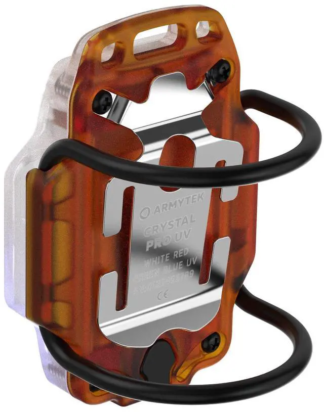 Crystal Pro UV can be used as a headlamp, attached to a belt or clothes, including specialized uniforms, carried on a strap or with keys. The model is also mounted on sporting gear using silicone rings. Body material and special arrangement of LEDs provide wide beam angle of 180°, optimal for close-range application.