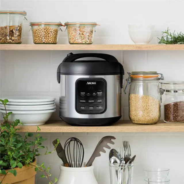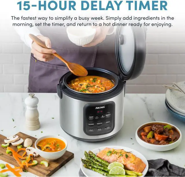 Easy-to-use, programable digital controls for: Rice, Grain, Oatmeal, Slow Cook, Steam, Risotto, Delay Timer.