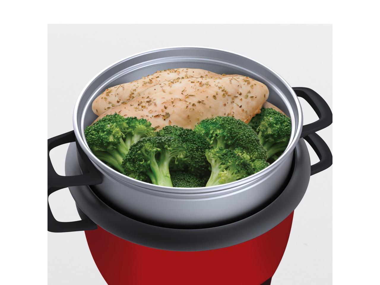 - Steams meat and vegetables while rice cooks below