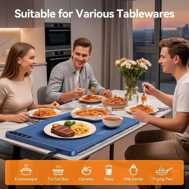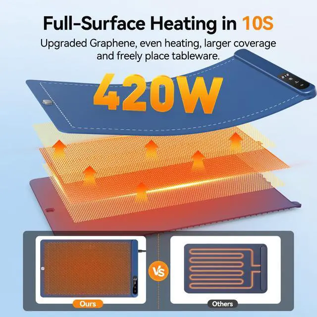 Electric warming tray employs graphene heating technology, offering greater coverage, faster and more uniform heating, and flexible placement of tableware.