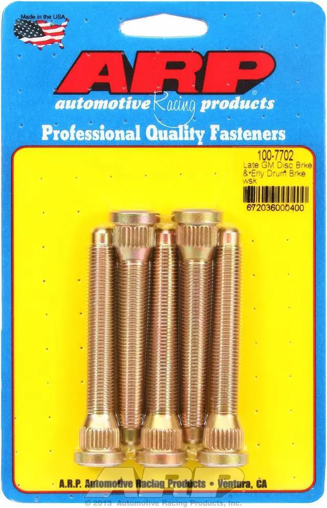 Wheel Stud - 7/16-20 in Thread - 3.200 in Long - 0.580 in Knurl - Chromoly - Cadmium - GM Disc / Drum Brake - Set of 5Automotive Racing Products (ARP) started in 1968, in Southern California. Their product line includes everything from engine and driveline fasteners for OEM replacement parts to exotic specialty hardware for the Formula 1, Indycar, NASCAR, NHRA Drag Racing, and Marine Applications. They produce a number of specialty products like cylinder head fastener kits, connecting rod bolts, exhaust manifold/header fastener kits, oil pan fastener kits, piston ring compressors, and more.