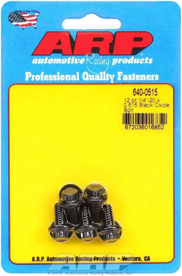 Bolt - 1/4-20 in Thread - 0.515 in Long - 5/16 in 12 Point Head - Chromoly - Black Oxide - Universal - Set of 5Automotive Racing Products (ARP) started in 1968, in Southern California. Their product line includes everything from engine and driveline fasteners for OEM replacement parts to exotic specialty hardware for the Formula 1, Indycar, NASCAR, NHRA Drag Racing, and Marine Applications. They produce a number of specialty products like cylinder head fastener kits, connecting rod bolts, exhaust manifold/header fastener kits, oil pan fastener kits, piston ring compressors, and more.