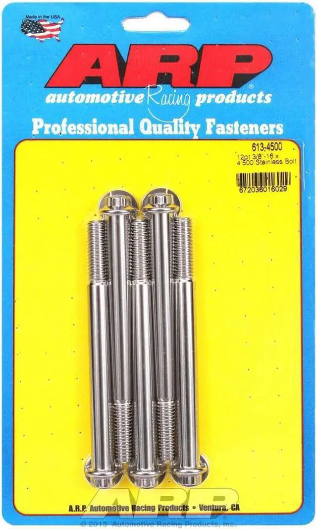 Bolt - 3/8-16 in Thread - 4.500 in Long - 3/8 in 12 Point Head - Stainless - Polished - Universal - Set of 5Automotive Racing Products (ARP) started in 1968, in Southern California. Their product line includes everything from engine and driveline fasteners for OEM replacement parts to exotic specialty hardware for the Formula 1, Indycar, NASCAR, NHRA Drag Racing, and Marine Applications. They produce a number of specialty products like cylinder head fastener kits, connecting rod bolts, exhaust manifold/header fastener kits, oil pan fastener kits, piston ring compressors, and more.
