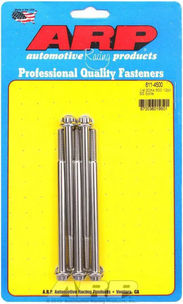 Bolt - 1/4-20 in Thread - 4.500 in Long - 5/16 in 12 Point Head - Stainless - Polished - Universal - Set of 5Automotive Racing Products (ARP) started in 1968, in Southern California. Their product line includes everything from engine and driveline fasteners for OEM replacement parts to exotic specialty hardware for the Formula 1, Indycar, NASCAR, NHRA Drag Racing, and Marine Applications. They produce a number of specialty products like cylinder head fastener kits, connecting rod bolts, exhaust manifold/header fastener kits, oil pan fastener kits, piston ring compressors, and more.