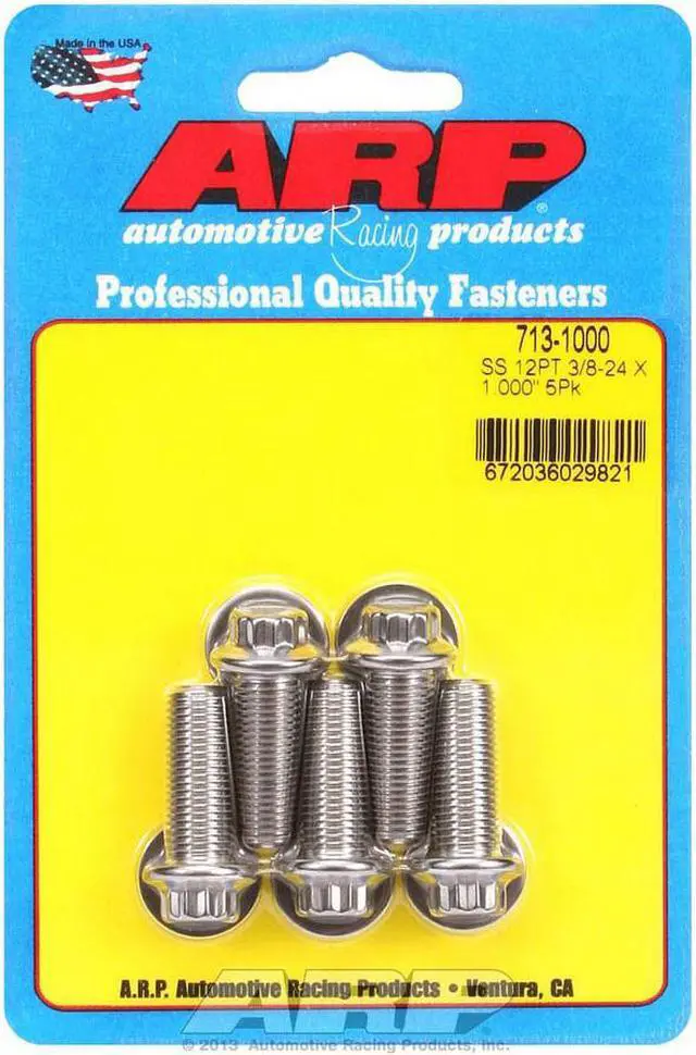 Bolt - 3/8-24 in Thread - 1.000 in Long - 3/8 in 12 Point Head - Stainless - Polished - Universal - Set of 5Automotive Racing Products (ARP) started in 1968, in Southern California. Their product line includes everything from engine and driveline fasteners for OEM replacement parts to exotic specialty hardware for the Formula 1, Indycar, NASCAR, NHRA Drag Racing, and Marine Applications. They produce a number of specialty products like cylinder head fastener kits, connecting rod bolts, exhaust manifold/header fastener kits, oil pan fastener kits, piston ring compressors, and more.