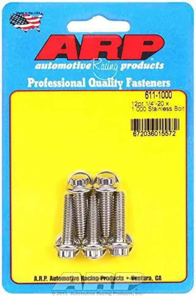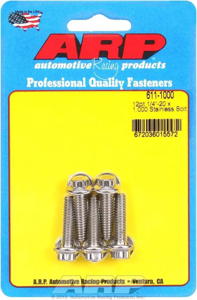 Bolt - 1/4-20 in Thread - 1.000 in Long - 5/16 in 12 Point Head - Stainless - Polished - Universal - Set of 5Automotive Racing Products (ARP) started in 1968, in Southern California. Their product line includes everything from engine and driveline fasteners for OEM replacement parts to exotic specialty hardware for the Formula 1, Indycar, NASCAR, NHRA Drag Racing, and Marine Applications. They produce a number of specialty products like cylinder head fastener kits, connecting rod bolts, exhaust manifold/header fastener kits, oil pan fastener kits, piston ring compressors, and more.