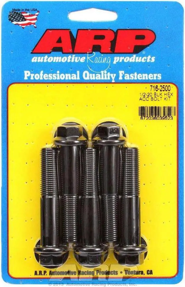 Bolt - 1/2-20 in Thread - 2.500 in Long - 9/16 in 12 Point Head - Chromoly - Black Oxide - Universal - Set of 5Automotive Racing Products (ARP) started in 1968, in Southern California. Their product line includes everything from engine and driveline fasteners for OEM replacement parts to exotic specialty hardware for the Formula 1, Indycar, NASCAR, NHRA Drag Racing, and Marine Applications. They produce a number of specialty products like cylinder head fastener kits, connecting rod bolts, exhaust manifold/header fastener kits, oil pan fastener kits, piston ring compressors, and more.