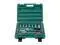 Made of high quality chrome vanadium steel for long lasting strength and durability. Mirror finishing for corrosion resistance and easy cleaning. Comes with 15 different standard length 1/4" drive sockets, 16 different 3/8" drive sockets, and 10 different 1/2" drive sockets, all with both SAE and metric sizes for varied use. Also includes 5 different metric 3/8" drive deep sockets for recessed bolts, and 2 spark plug sockets for a 3/8" drive, in sizes 5/8" and 13/16". Comes with 2 high-grade, 72 teeth pear-head ratchets with 3/8" and 1/2" drives, and a 1/4" drive soft-grip spinner handle. Accessories include a 3/8" female to 1/4" male adapter, a 3/8" drive 3" extension bar, and a 1/2" drive 5" extension bar. Packed in a heavy-duty blow mold carrying case for long-lasting and easy mobility. Meets or exceeds ANSI standards.