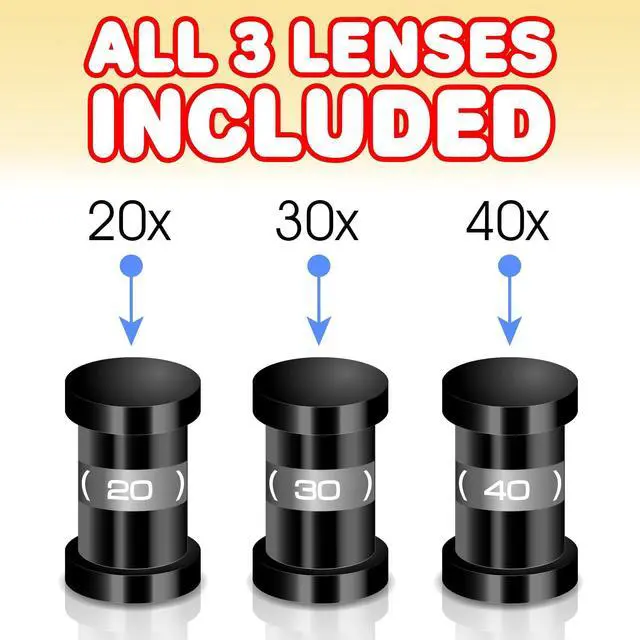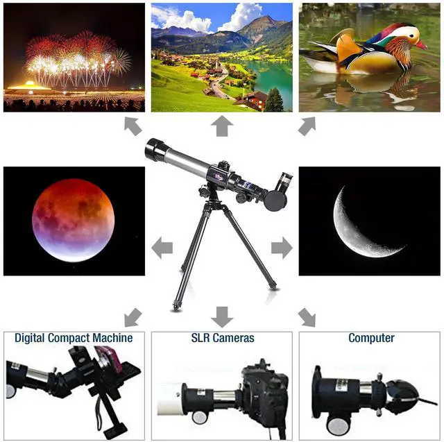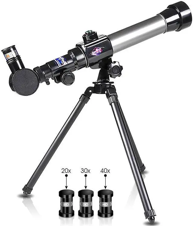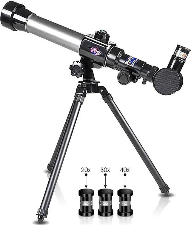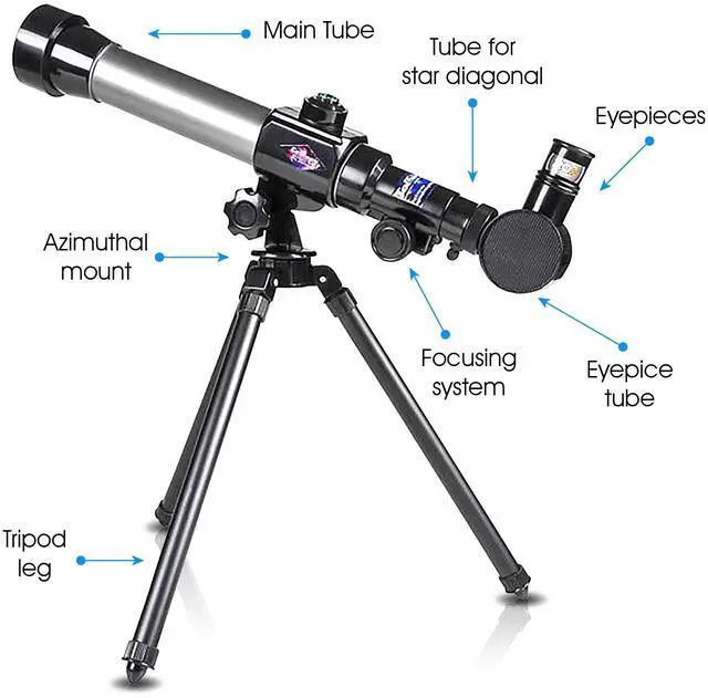 The set includes a telescope, 3 magnification lenses (20x, 30x & 40x), diagonal mirror and a tabletop tripod stand for a steady image while exploring the skies.