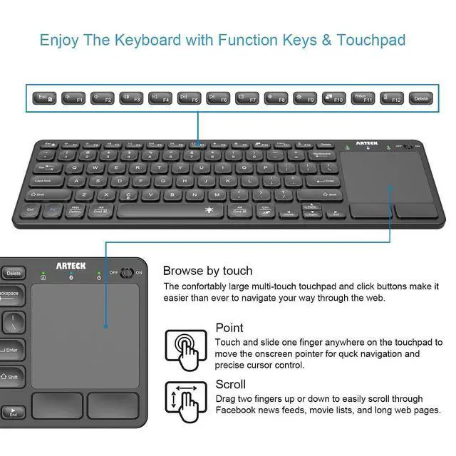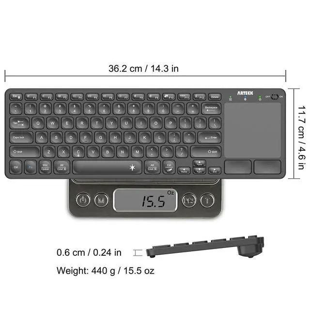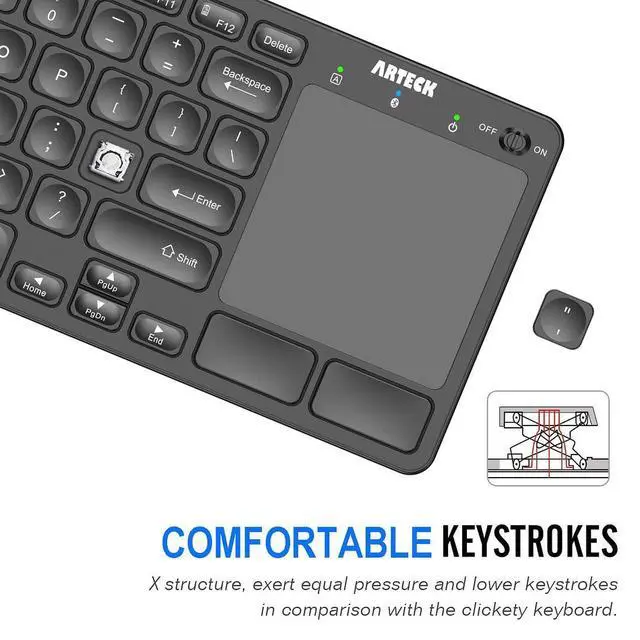 The keyboard works up to 10 meters (33 feet) which allows you to sit in the comfortable couch and use the touch keyboard in the large room. Longer working distance makes the typing more enjoyable and trouble free. It allows you to gain quick access to common functions, such as volume level, playback control, copy paste text, and more. Make sure the keyboard is less than 10 meters (33 feet) from the computer to avoid the signal disconnecting.