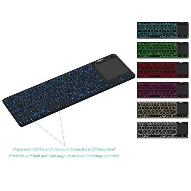 Elegant blue LED backlight with 2 adjustable brightness level, 7 different colors(deep blue, soft blue, bright green, soft green, red, purple, cyan) making typing that much more enjoyable and awesome to look at. Backlight will auto turn off when idle to conserve power for when it is most needed.