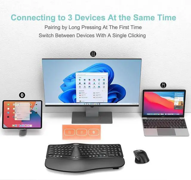This keyboard is able to connect to 3 devices (2.4G USB-A Wireless + 2.4G USB-C Wireless + Bluetooth) at the same time. After you pair the keyboard with 3 devices by long pressing the channel button at the first time, you can simply switch the keyboard to work on any of the device with a single button clicking.