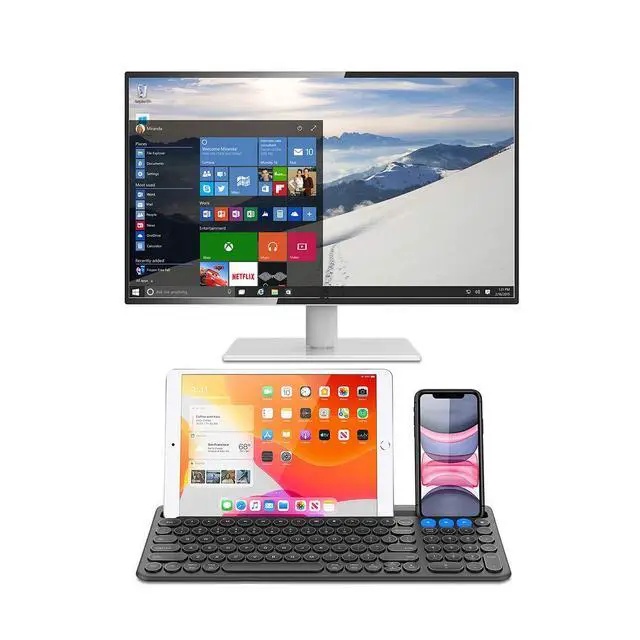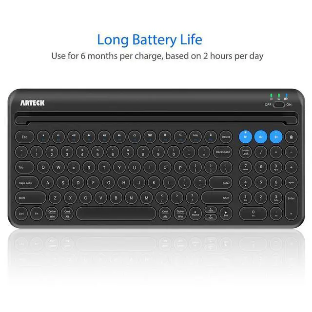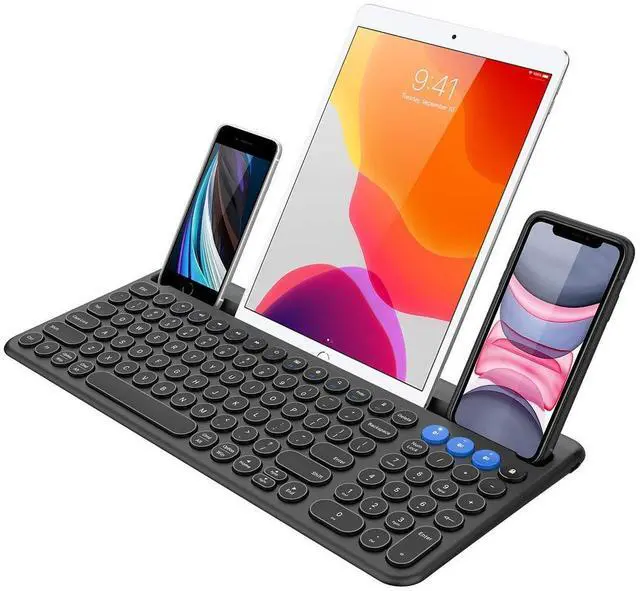This keyboard is able to connect to 3 devices at the same time. After you pair the keyboard with 3 devices by long pressing the blue key at the first time, you can simply switch the keyboard to type on any of the device with a single key clicking.