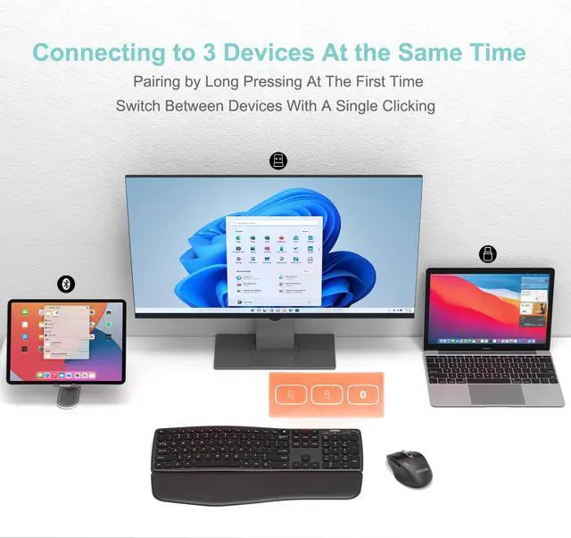 This keyboard comes with a nano USB-A receiver, USB-C receiver and Bluetooth compatible. The keyboard is able to connect to 3 devices at the same time. After pairing the keyboard with 3 devices, you can simply switch the keyboard to type on any of the devices with a single key clicking.