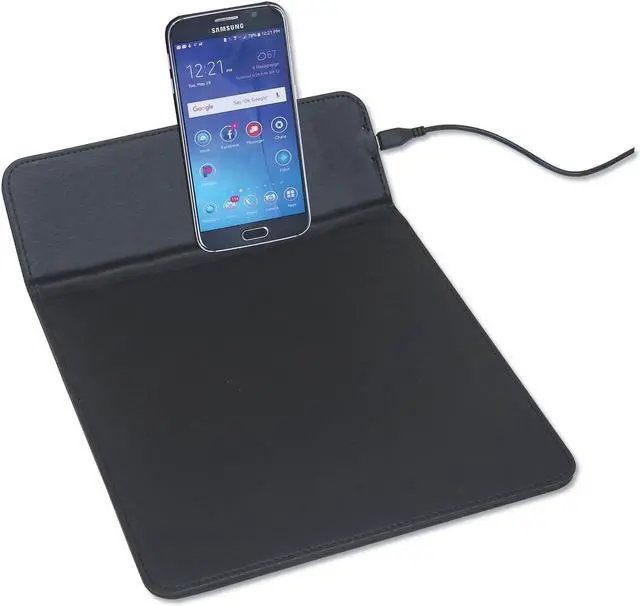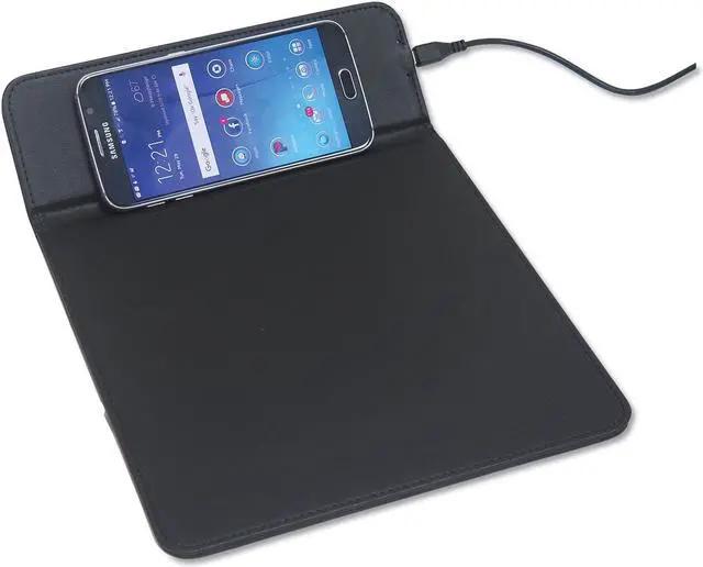 Charge mobile phone wirelessly with our Qi-Certified Wireless Charging Pad. Plug the provided micro-USB cable into any USB power source and power away. Compatible with iPhone 8/8Plus, iPhone X, Samsung 6/6 Plus and later models. Pad can be used completely flat or fold the panel up for an angled view. Features a smooth writing surface. Made of leather-like material.