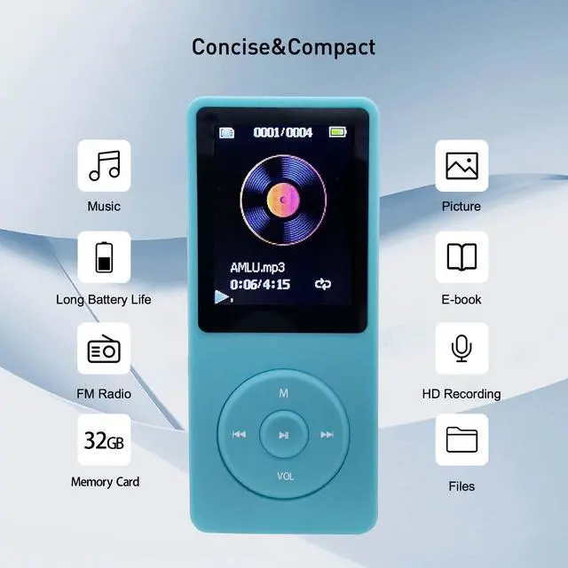 MP3 Player 32GB with Speaker Earphone Portable Mini Light Blue Music Player Support Voice Recorder E-Book 1.8 inch HD Screen Support up to 128GB