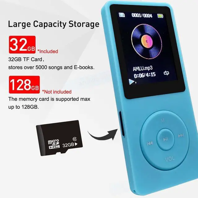 32GB micro SD card, stores over 5,000 songs and E-books. Note: for avoiding card missing, the micro SD card is inserted into the player before sending to you.