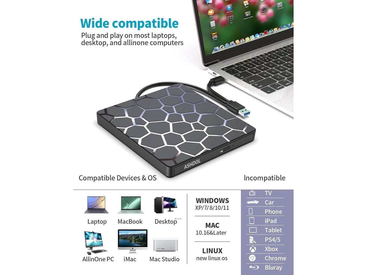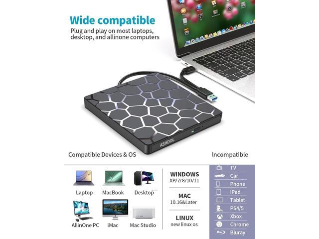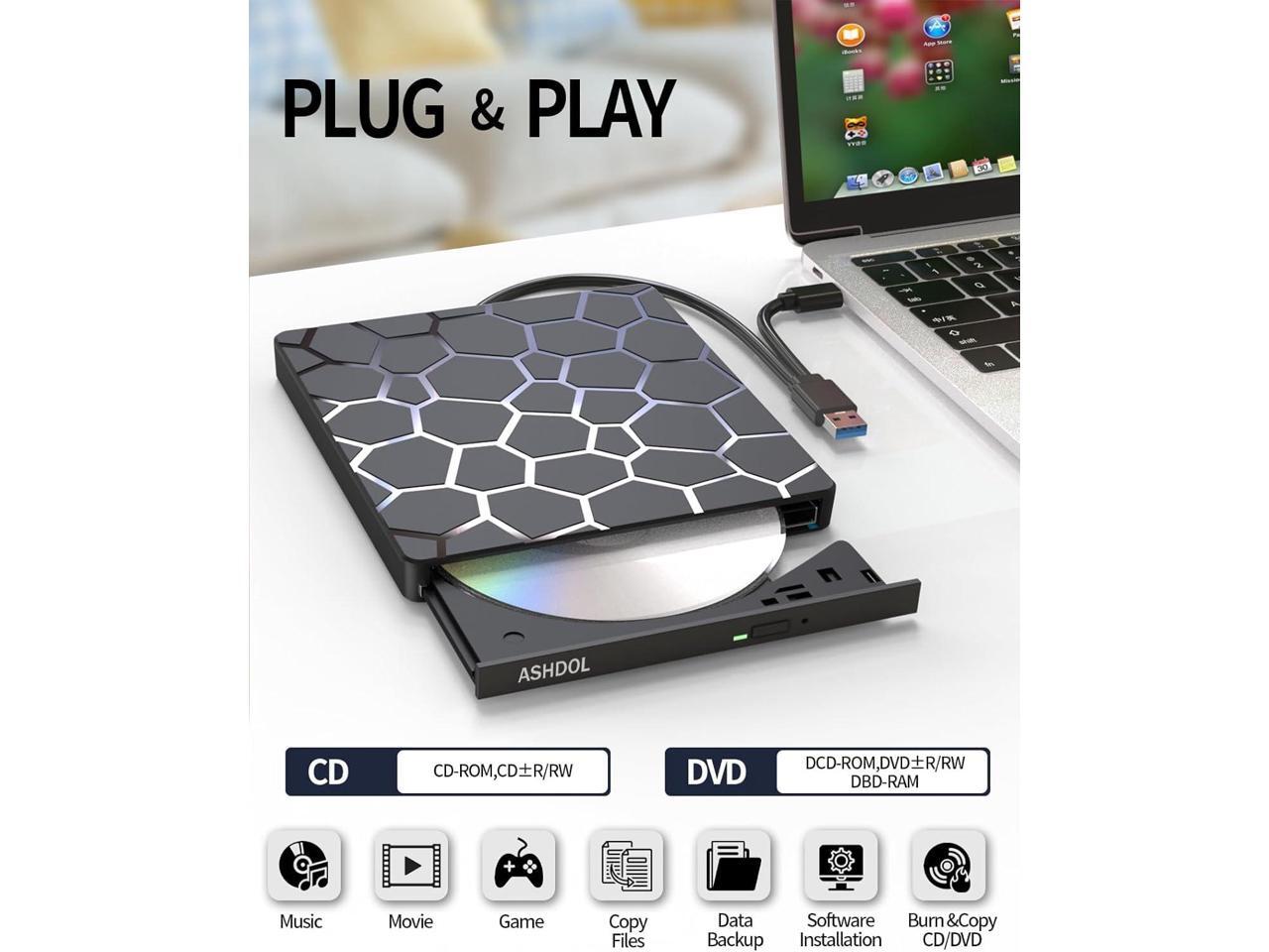 - EXTERNAL CD DVD DRIVE FOR LAPTOP- Are you still worried about your computer not having a driver? The external dvd drive that ASHDOL newly released is a good solution. No need for additional drivers.plug and play. The CD Rom external cd drive for laptop has strong error correction, anti-skid and quiet capabilities.