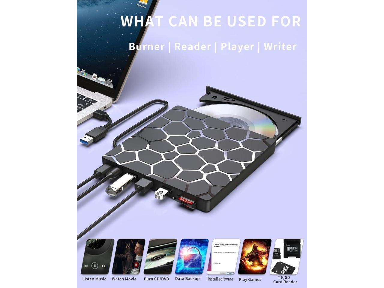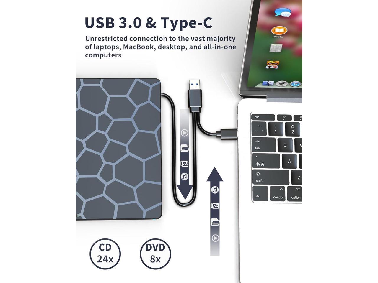 - USB 3.0 HIGH SPEED DATA TRANSFER- CD Burner with high speed USB 3.0 and Type-C technology, many of the port cluster connectors backward compatible with USB 2.0 / 1.1. Experience rapid data transfers with advanced USB 3.0 technology, which is approximately 10 times faster than USB 2.(rates up to 5 Gigabits/S 625MB/S),Brand-new loader with strong error correction, low powerconsumption,and high speed.Besids that,The portable CD DVD player supports writing speeds up to 24x for CDs and reading speeds up to 8x for DVDs, ensuring efficient, smooth and stable operation,faster than you expected.