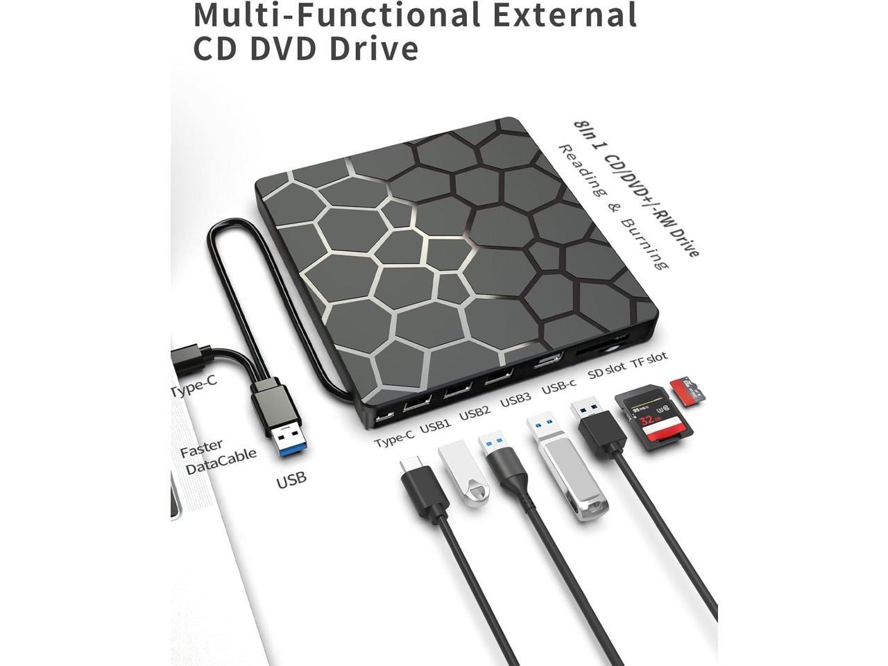 ASHDOL External CD DVD Drive,8 in 1 USB 3.0 and Type-C Disc Reader Writer Burner Player,Slim and Portable CD DVD +/-RW Optical Drive for PC Laptop Desktop MacBook Mac Windows Linux OS Apple (8 in 1)