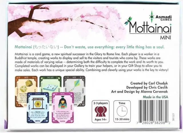 Mottainai refines and transforms the core gameplay of the out of print Glory to Rome, and takes players on a journey to a Buddhist temple to create various works of art. Each of the cards in Mottainai is unique, featuring beautiful watercolor illustrations of the works. Every one has a special ability, which in typical Chudyk fashion can and will need to be combined cleverly with other cards to outwit your opponents. The Mottainai Mini edition comes in smaller packaging for a lower price with one deck, for 2-3 player games. Two copies of Mottainai Mini can be combined to play a 4-5 player game.