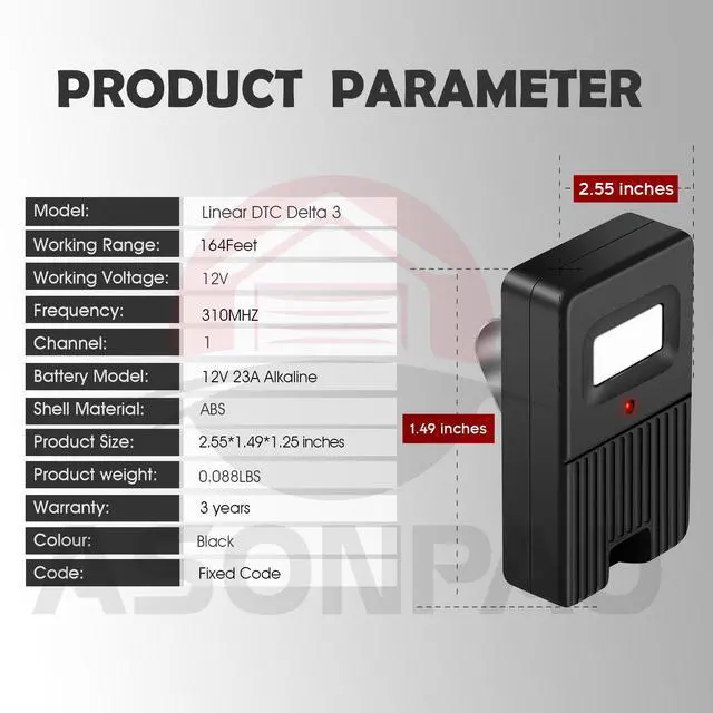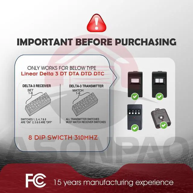 **Compatible model**: only works for 310MHZ Linear Delta 3 (DT DTA DTD DTC DNT00002A) Remote 8 Position Dip Switch.