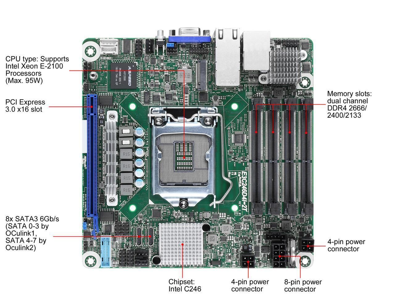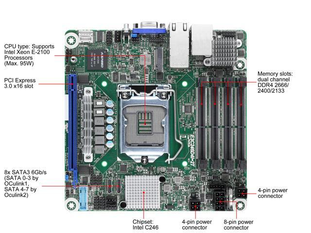 Support 8 x SATA3 by C246 (from 2 x OCulink) + 1 x M.2 (NGFF 2280, PCI-E Gen3 x4 link or SATA signal)