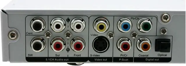 | Connectors | Video Inputs: CVBS, S-Video, YUV Video Outputs: Component, S-Video, Composite Audio Outputs: 2 Channel, 5.1 Channel, Optical & Coaxial Digital NTSC & PAL System Disc Play & Output: Auto Switching Output |