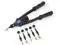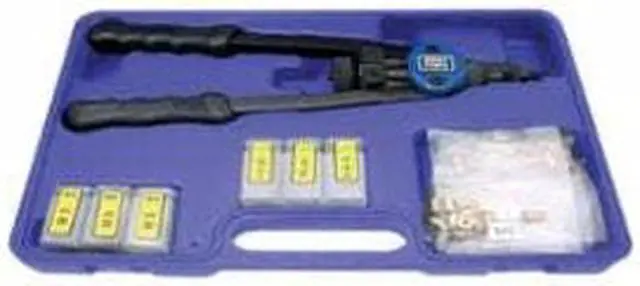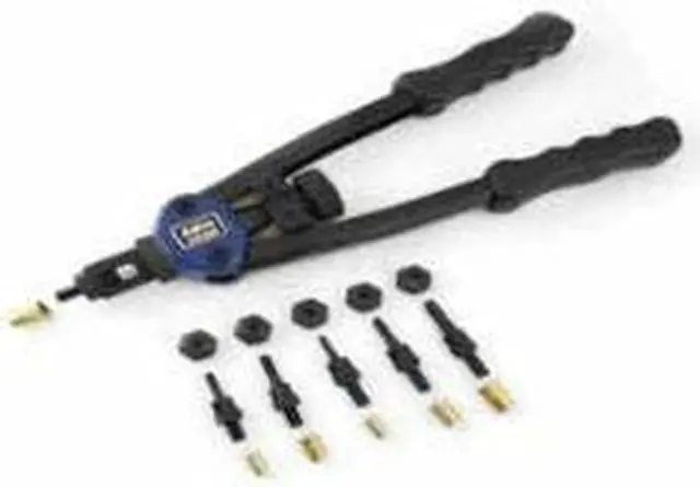 The Astro 1442 13" Nut/Thread Setting Hand Riveter Kit has been recently improved with an innovative head assembly that allows for the quick changing of mandrels without any tools required at no additional cost! This versatile and powerful hand nut/thread setting riveter takes the hard work out of setting rivet nuts and is ideal for working in hard-to-reach areas. The 1442 is constructed with a patented structure which increases power and reduces shock and a shorter handle with double compound hinges that maximize leverage. This kit includes a Hand Nut/Thread Setting Riveter, 6 interchangeable mandrel/nose pieces in Metric M5, M6, & M8 and in SAE 10-24, 1/4-20, & 5/16-18.