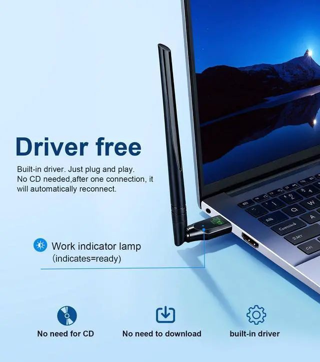 A: The WiFi adapter comes with a built-in driver. Once you plug it into your PC, simply click on the driver installation prompt that appears to complete the setup. It will automatically reconnect after the first pairing, so you'll never have to reinstall the drivers.