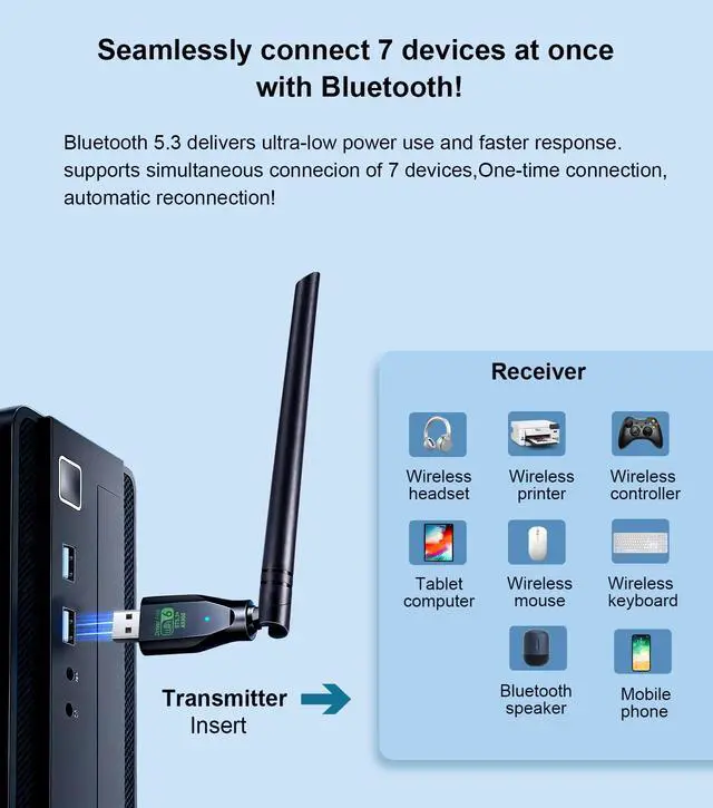 Connect up to 7 Bluetooth devices at the same time—like your PC, laptop, Bluetooth headphones, speakers, keyboard, mouse printer IPhone iPad and more—all with one powerful adapter.