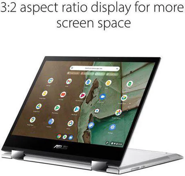 Powered by MediaTek 820 (8192) Processor 2.2GH z (2M Cache, up to 2.2GH z, 8 cores) 64GB eMMC storage and 4GB LPDDR4X RAM, Wi-Fi 5 ( 802.11 ac) + Bluetooth 5.0 (Dual Band) 12.0" HD+ Touchscreen (1366*912), 3:2 Glossy Display with USI stylus support (stylus sold separately) A durable 360 degree hinge that can be used to flip the touchscreen display to tent, stand and tablet modes 1*Combo Audio Jack, 1*USB 3.2 Type-A (Gen 1), 2*USB 3.2 Type-C (Gen 1) and Micro SD card reader Lightweight at only 2.5 lbs and up to 16 hours of battery life (Battery life varies by working conditions) Chromebooks run on Chrome OS and has the Google apps.