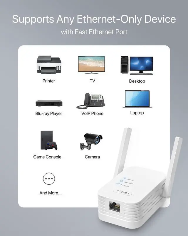 Say goodbye to cable clutters with our WiFi to Ethernet adapter. It connects to your WiFi router wirelessly and delivers a consistent connection to your wired device via its built-in Ethernet port. It requires no driver software installation and works with any wired devices, such as your printer, TV, desktop, laptop, VoIP phone, and streaming player.