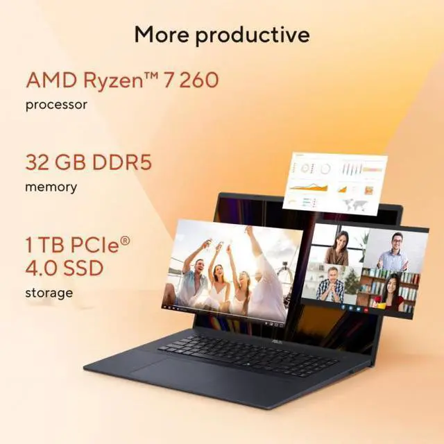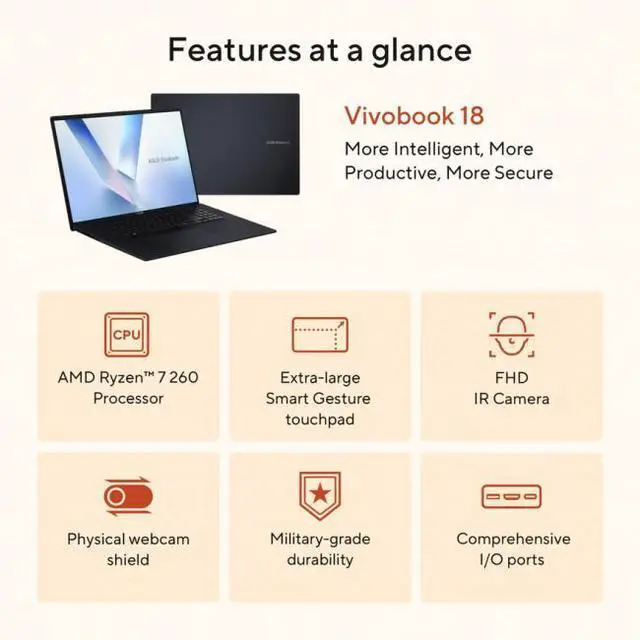 The ASUS Vivobook 18 combines powerful AMD Ryzen 7 performance, 32GB DDR5 RAM, and 1TB PCIe Gen4 SSD with a large 18" WUXGA IPS display for immersive visuals. With AI-powered Copilot, fast charging, all-day battery, and a sleek, durable design, it’ s perfect for productivity, entertainment, and multitasking on the go. Powerful Performance AMD Ryzen 7 260 octa-core processor with 16 threads, up to 5.10 GHz Turbo, 32GB DDR5 RAM, and 1TB PCIe Gen4 SSD for smooth multitasking, fast app launches, and AI-assisted workflows with Copilot.