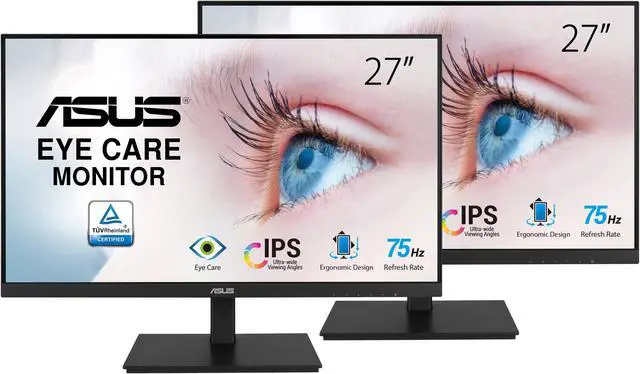 Model: ASUS VA27DQSB Color: BlackDisplay Size: 27"Resolution: Full HD (1920x1080)Refresh Rate: 75HzPanel Type Details: IPS Video Ports: 2 x USB 2.0, Display Port (DP), HDMI, VGA Aspect Ratio: 16:9Contrast Ratio: 1,000:1Built-In Audio: Built-in SpeakersResponse Time: 5 msViewing Angle: 178° (H) / 178° (V)Display Colors: 16.7 MillionBrightness: 250 NitsDisplay Pixel Pitch: 0.311mm (82 Pixels Per Inch)Additional Audio Ports: 3.5mm Audio OutputVESA Compatibility: 100x100mmEye Care Features: Low Blue LightAMD Freesync: YesFlicker Free Technology: YesAdjustments: Height Adjustment 5.9" / 150 mm, Rotation Adjustment 180° (-90 to 90°), Swivel Adjustment 360° (-180 to 180°), Tilt Adjustment -5 to 35° Product Dimensions (WxLxH): 24.1 IN x 8.9 IN x 20.6 IN Weight: 15lbmonitorwarinfo