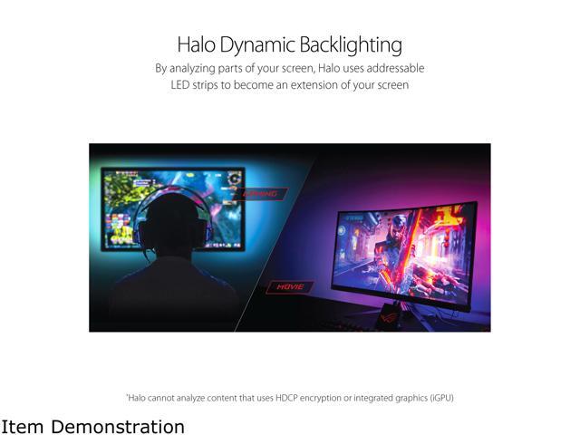 - ROG Halo Software intelligently casts RGB lighting backlighting effects into the room when playing games or watching movies