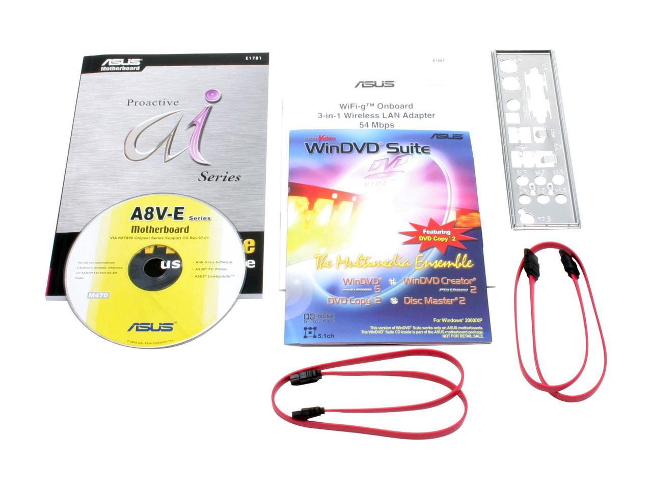 | Package Contents | A8V-E Deluxe Driver Disk 2 x User Manual IDE/PATA Cables FDD Cable 2 x SATA Cable 4-pin to SATA Power Cable USB and Game/MIDI Bracket Serial/COM Bracket IEEE 1394 Bracket |