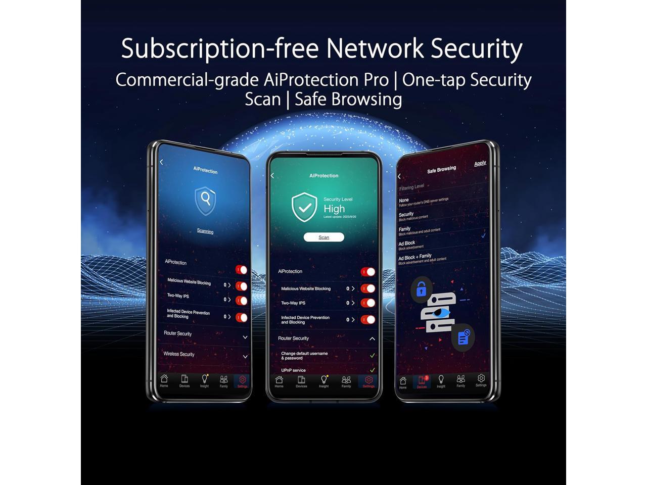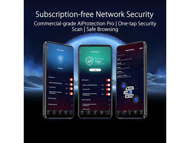 - VPN features including advanced site-to-site VPN & the Instant Guard mobile. Subscription-free network security with commercial-grade AiProtection Pro powered by Trend Micro™ plus a one-tap security scan & Safe Browsing