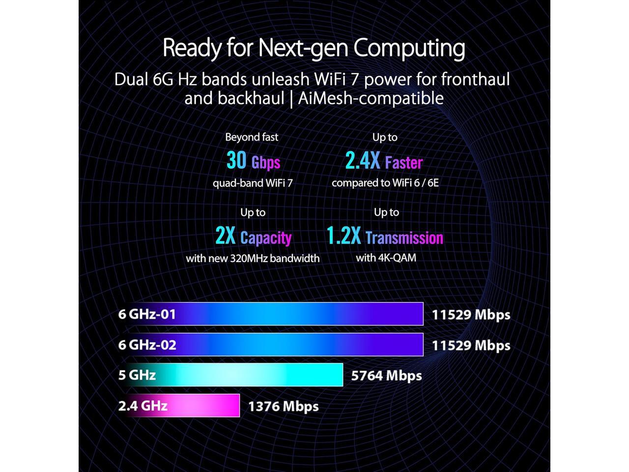 - Beyond-fast WiFi7 with new 320MHz channels in the 6 GHz band & 4096-QAM significantly increases network capacity and throughput with speeds of up to 30Gbps