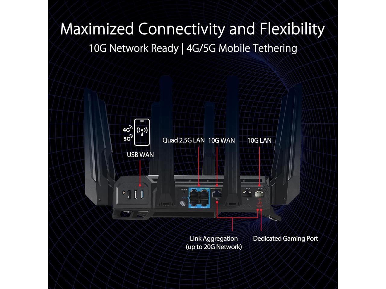 ASUS ROG Rapture GT-BE98 PRO First Quad-Band WiFi 7 Gaming Router supports 320MHz, Dual 10G Port, Triple-level Game Acceleration, Mobile Game Mode, Subscription-Free Security, AiMesh, and VPN features
