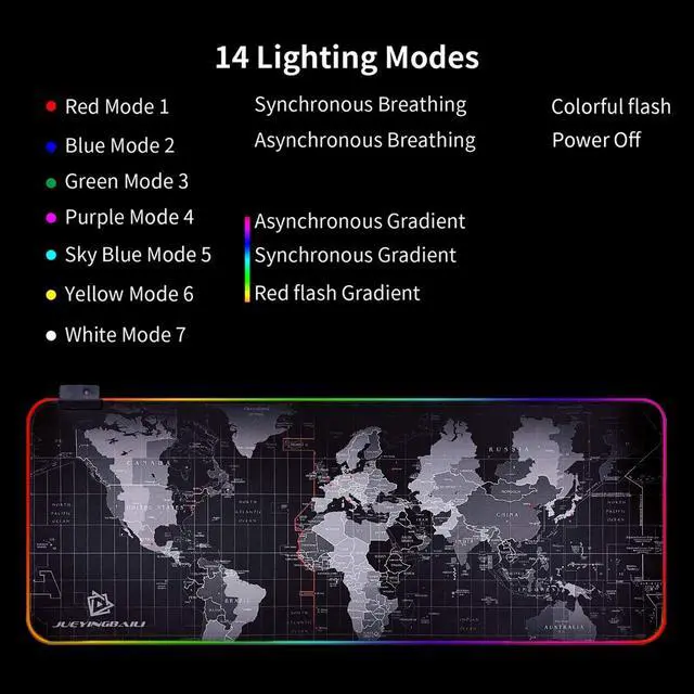 • unique led lighting - the rgb gaming mouse pad features 14 lighting modes: includes 7 kinds of monochromatic light, 1 kind of rgb alternating, 2 kinds of rgb breathing , 3 kinds of rgb running. this led rgb mouse pad can create a cool gaming atmosphere through choosing the color mode.